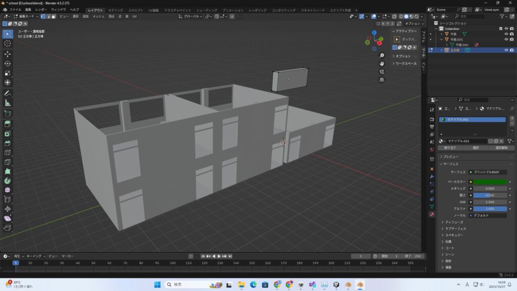 二松学舎を自分で作ってみたもの。(製作時間2時間ちょい)一応寸法は、1-2をもとにしているが、あまりにも無駄なポリゴンが頻出している。今後はBlenderのアドオンであるArchmeshを活用して、BlenderとUnityでのモデリングしたもののインポートやテクスチャ設定、プレイヤーの行動の設定などについて調べていきたい。