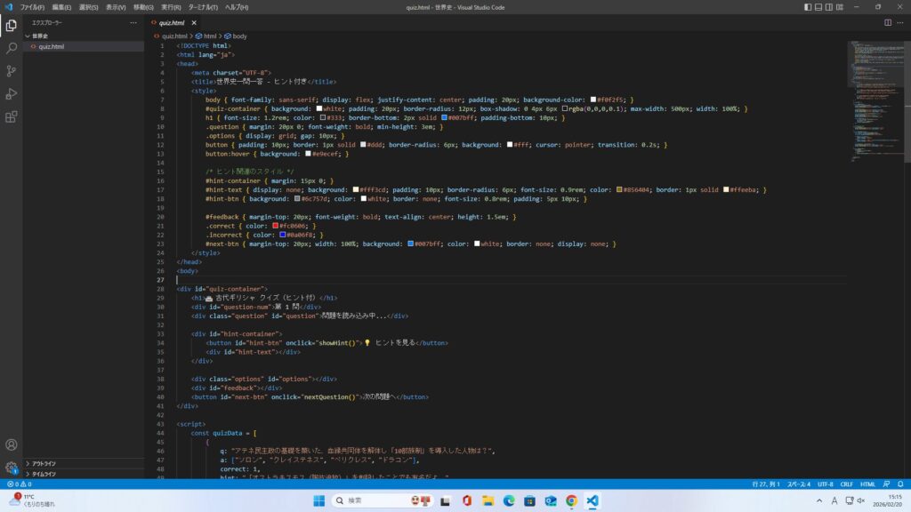 20260220 吉﨑衆政 未分類 X Bluesky はてブ LINE Pinterest コピー 2026.02.20 この記事は約1分で読めます。 今週の振り返り Visual Studio Codeを少し触ってみた。java scriptの構文は、やはりpythonのものとは相違点があり、難しい。
